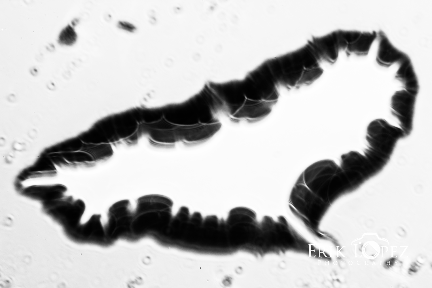 En mi visita al centro, decidí comprarme una lupa para unas ideas raras que tengo. Sin embargo, por ahora la utilicé para intentar nuevas fotos macro. Experimenté con una pequeña flor pero no logré enfocar del todo bien. Necesito un riel de enfoque, el cual ya compré y deberá estar en mis manos para cuando publique estas líneas. Por el momento, decidí jugar con cosas más abstractas. Residuos de agua fueron la opción. Una diminuta gota tiene una forma interesante cuando se maximiza su tamaño y se ilumina de forma correcta. La fotografía 199 es una de esas cosas extrañas que te encuentras cuando decides mirar el mundo de otra forma… o quizá he visto demasiadas películas de acción.